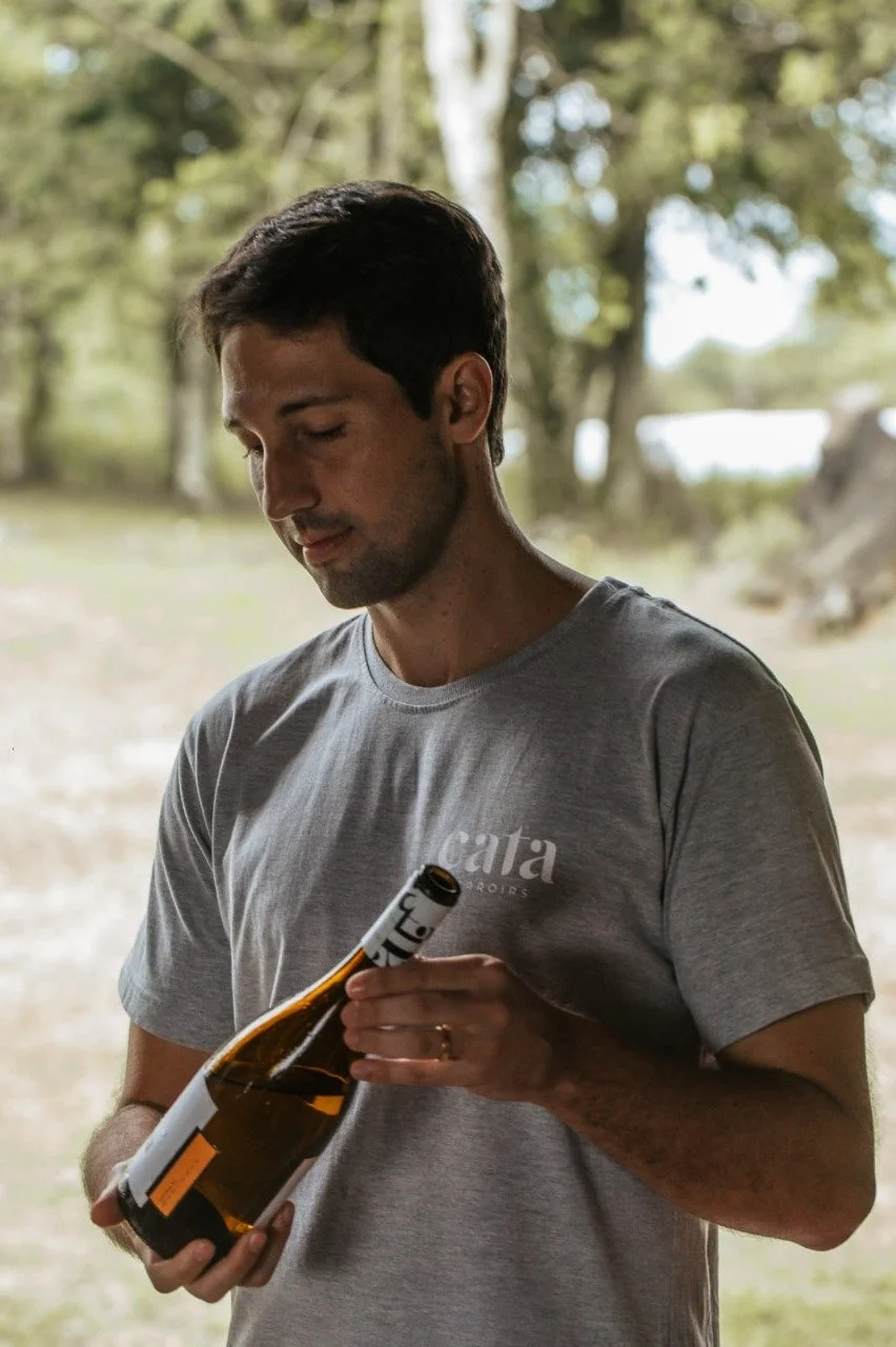 “O tempo é para o vinho: ouvimos o que ele tem a dizer e apreciamos o processo”, explica Edu, enólogo que encanta com a paixão que revela em seu dia a dia nos vinhedos — de igual tamanho do seu conhecimento e experiência. Eduardo Strechar é formado em Viticultura e Enologia na Austrália e muito jovem já estava em campo pelo mundo, trabalhando no Chile, na Itália até se fixar de volta no Brasil, na região vinícola de Santa Catarina. André é enófilo, sócio investidor, e está no Rio de Janeiro. Luca Fumagalli é um gaúcho erradicado em Curitiba e Florianópolis, uma cabeça com os pés no chão, os olhos no futuro e a taça na mão, percorrendo o mercado com uma estratégia firme e serena para servir os vinhos nas boas mesas da gastronomia. Cata é a forma carinhosa de chamar os nascidos em Santa Catarina; é também a expressão, em português, de caçar, procurar — essência da marca — e cata é, ainda, degustar, em espanhol.