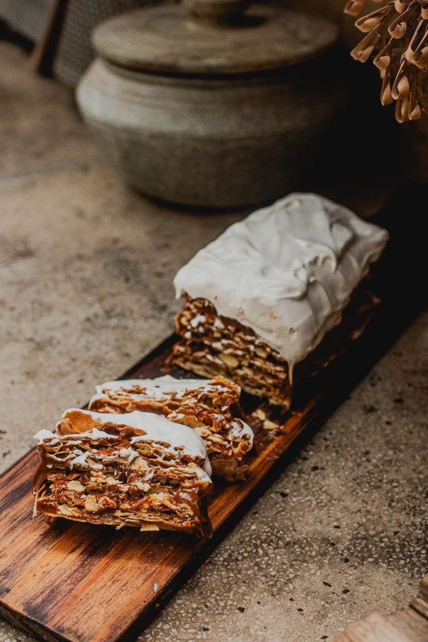 Kassandra consolidou seu estilo na confeitaria, com bolos, doces, tortas, folhados de sofisticada viennoiserie, pães e chocolateria que só de lembrar fico com desejo. Confeiteira das casas em Porto Alegre onde assino cardápio, tive a oportunidade de estar próxima a ela e Bruno e de provar sua gastronomia de extremo capricho e conforto. Bolos para café que iniciam uma conversa, madeleines que sussurram segredos, fofas e delicadas. No Poleiro, o ritmo é esse, o das fornadas: uma hora os pães, logo mais o perfume do café — escolhido a dedo entre as excelentes torrefações de especiais que existem no Rio Grande do Sul —, cookies chocolatudos, sanduíches em pães de fermentação natural, quiches, uma torta folheada com doce de leite que é de comer rezando. O clima convida.
